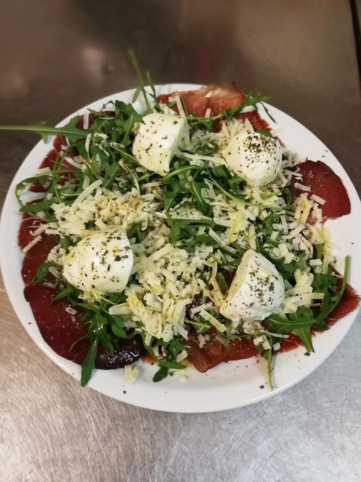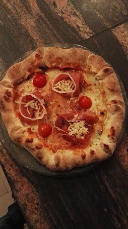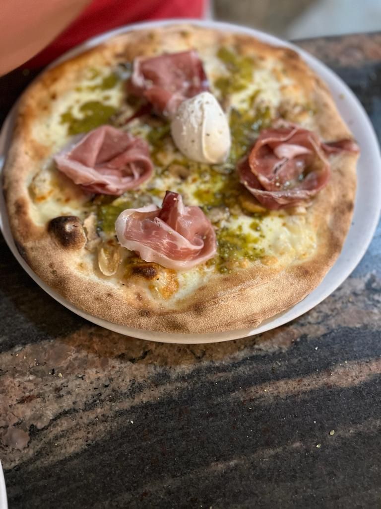 Novità In pizzeria Al Rustico, dedicata alla nascita del nipote, Pizza Edoardo specialità della casa con 50 % di mozzarella di bufala e 50 % fiordilatte, funghi freschi, speck e granella di pistacchio.